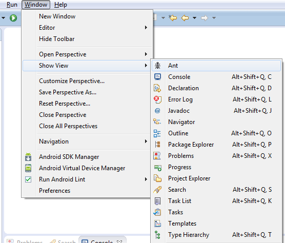 Para instalar build.xml na paleta Ant do Eclipse, selecione Windows -> Show View -> Ant