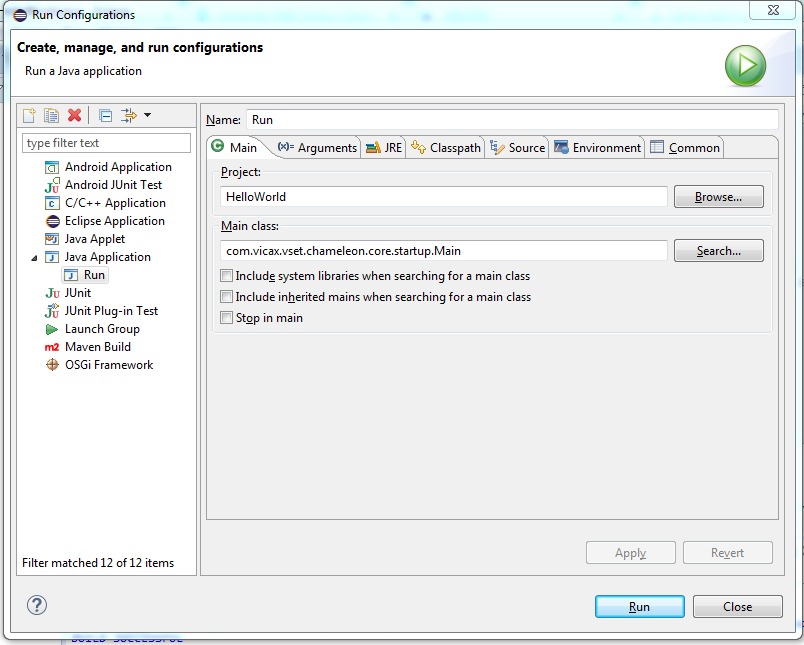 Para execução do módulo é necessário também configurar Run Configurations -> Java Application e selecionar a Main Class com.vicax.vset.chameleon.core.startup.Main.